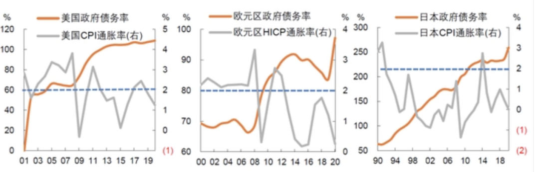 2020年前美欧日政府债务率与CPI