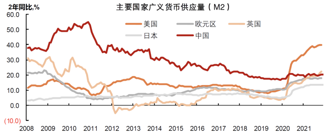 在2020年新冠疫情爆发前,发达国家的通货膨胀已经消失了近30年。新冠疫情的冲击下,全球主要国家的金融系统都出现了流动性危机。美国为了应对危机,同时也看到日本央行的超常规货币政策并未带来严重后果,产生了误判,过于猛烈地启动了“零利率+量化宽松”组合,把联邦基金利率降至零利率区间,把存款准备金率降为零,美联储两年里买入了接近6万亿美元的美国国债和抵押贷款债券,支持财政部进行了三轮财政刺激,直接向个人支付经济影响付款8000多亿美元,同时还提供额外的失业补偿、紧急租房援助,对企业部门贷款合计近7000亿美元,M2因此急剧扩张。