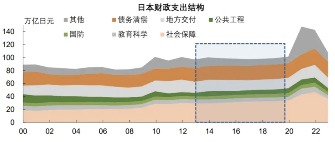 虽然日本央行通过货币超发购买了大量国债,但2012年至2019年日本政府财政支出仅由97.1万亿日元升至101.4万亿日元,政府支出并未出现明显的扩张。在政府支出结构上,社会保障有所增加,主要用于加强医疗、养老金等老龄化社会保障,以及日本大地震后灾区公共基础设施重建。
