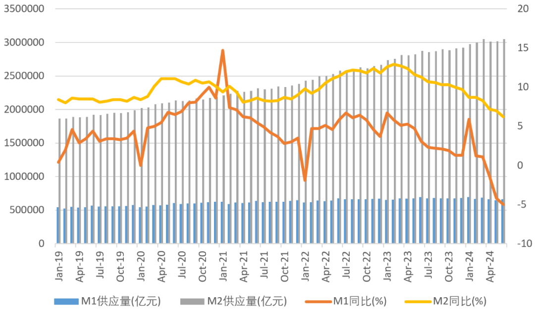 特别是2024年后M1快速下滑,六月跌至-5,这表明企业大量活期存款转换为定期存款,或货币基金、债券基金等理财产品,社会投资、消费需求极度萎靡。在这种情况下,单从金融角度看,其实需要央行发出明确、清晰、有力的经济见底信号,以扭转社会预期。